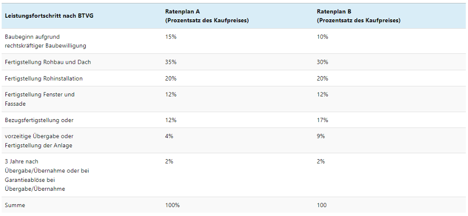Werden Zahlungen nach Ratenplan vereinbart, dann müssen diese nach Abschluss des entsprechenden Bauabschnitts beglichen werden. Dies gilt sowohl für Neubauten als auch für die grundlegende Erneuerung von Altbauten. Prinzipiell muss die erste Zahlungsrate ab Baubeginn gezahlt werden.